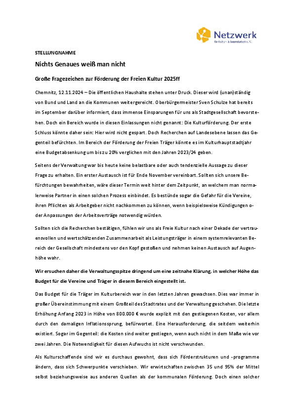 Chemnitz, 12.11.2024 – Das Netzwerk für Kultur- und Jugendarbeit e.V. als Dachverband der Freie Kulturträger in Chemnitz hat angesichts der Nichtkommunikation der Verwaltung große Fragezeichen zur Förderung der Freien Kultur 2025 und in den Folgejahre