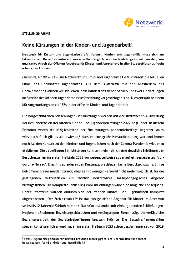 Insgesamt wären von den derzeitigen Plänen nach Kenntnis des Stadtjugendrings, der Teil des Netzwerk für Kultur und Jugendarbeit e. V. ist, mindestens zwei Einrichtungen und sieben Stellen im Bereich der Offenen Kinder- und Jugendarbeit betroffen. Langjährig aufgebaute Strukturen werden ohne eine klare Perspektive und eine tragfähige fachliche Begründung gekürzt.